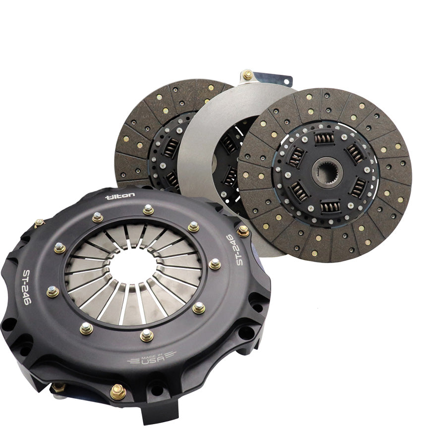 Tilton has applied their nearly 50 years of experience in racing clutches to develop the ST-246 line of 246mm (9.7”) twin disc clutch kits for the high-performance street market. Unlike many of the “performance clutches” on the market, ST-246 clutches were engineered from the ground up as a true performance twin disc clutch and not an OEM-type stamped steel pressure plate with a floater plate added. ST-246 clutches are designed to provide high torque capacity, low wear rate, smooth shifting and good drivability. ST-246 twin disc clutch kit is available with sprung-hub organic discs (850 lb-ft capacity).