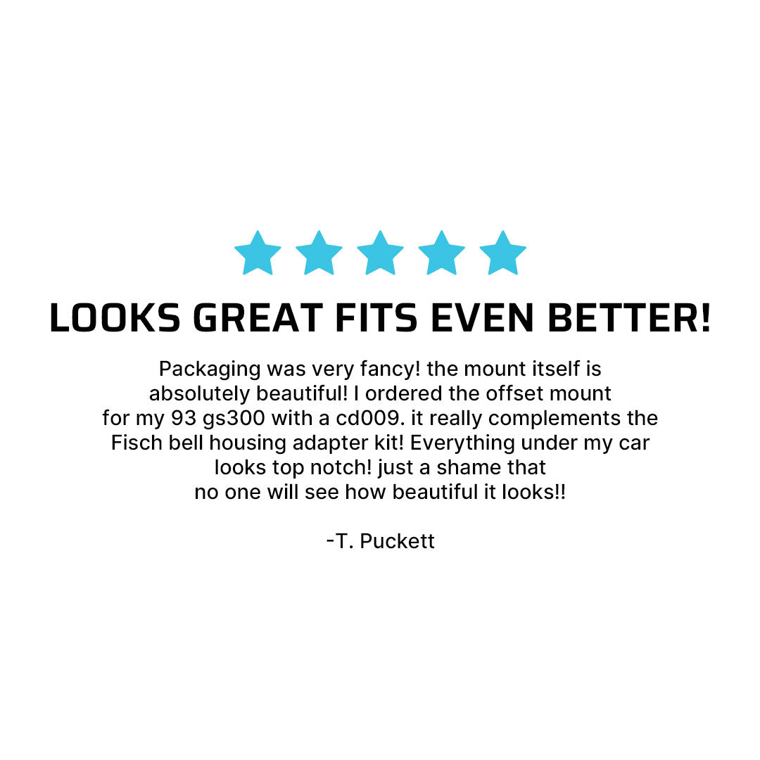 packaging was very fancy! the mount itself is absolutely beautiful! I ordered the offset mount for my 93 gs300 with a cd009. it really complements the Fisch bell housing adapter kit! Everything under my car looks top notch! just a shame that no one will see how beautiful it looks!!